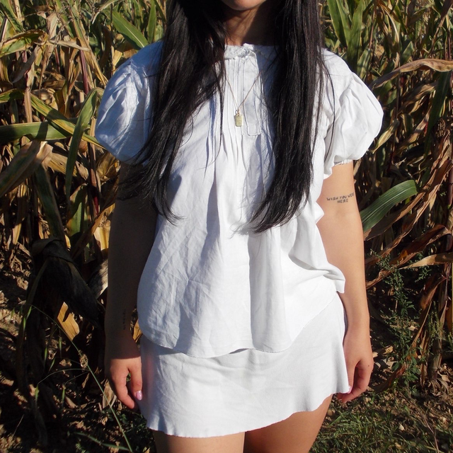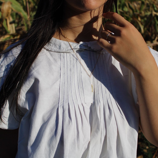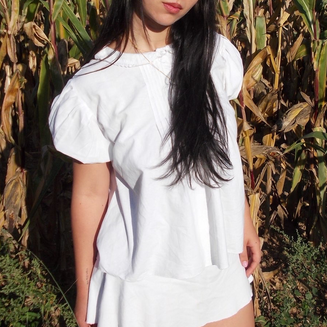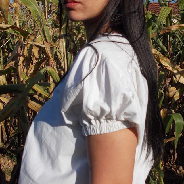 La blouse Sunray est un top babydoll en coton revalorisé, avec un col Claudine surpiqué et orné de dentelle française. Les manches ballons sont dotées d'élastiques afin de s'adapter au corps tout en gardant l'effet bouffant.