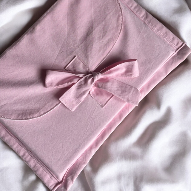 La housse soft pink est réalisée en cotton rose et doublée de la même matière en blanc. Elle est souple -pas de rembourrage- et se referme avec un joli noeud.