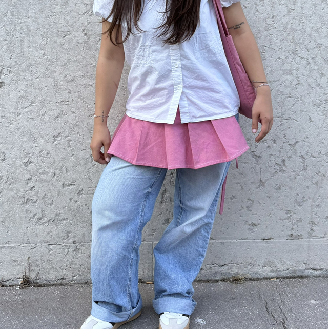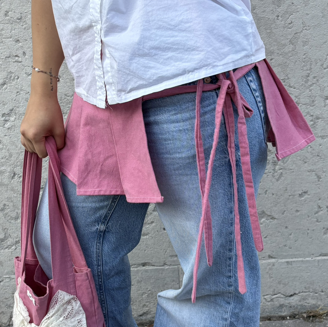 La mini jupe Lacy est idéale pour le layering ; elle se noue sur le coté avec des rubans tombants laissant apparaitre votre vêtement d'en dessous. Elle est en toile de coton rose revalorisée.
