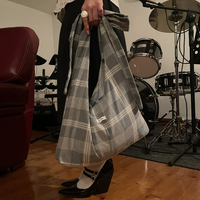 Il est créé dans un tartan style délavé, avec une grande anse que vous pouvez mettre à l’épaule ou en bandoulière. Vous pouvez ajuster le noeud pour régler la taille.